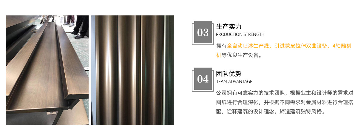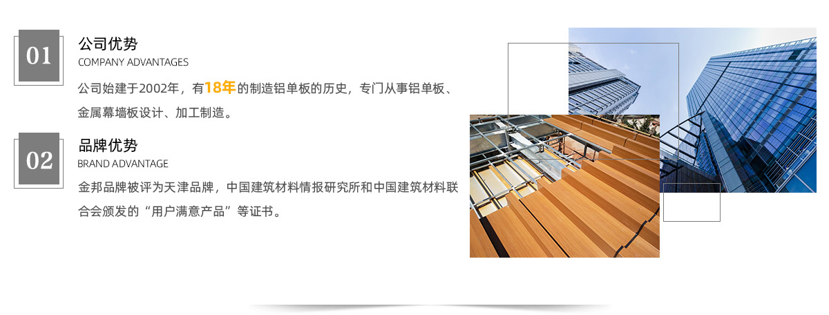 天津金邦建材有限公司始建于2002年,有18年的制造鋁單板的歷史,天津金邦晟泰建材有限公司傳承于天津金邦建材有限公司,從事鋁單板、金屬幕墻板設(shè)計(jì)、加工制造,公司堅(jiān)持走自我創(chuàng)新之路,近年來(lái)碩果累累,實(shí)現(xiàn)了公司的飛速發(fā)展。2017年為適應(yīng)新市場(chǎng),配合產(chǎn)業(yè)升級(jí)改造,天津金邦建材有限公司全資投建天津金邦晟泰建材有限公司,公司注冊(cè)地為天津靜海區(qū)中旺產(chǎn)業(yè)園內(nèi),占地60余畝,新建全華北地區(qū)全自動(dòng)噴淋生產(chǎn)線(xiàn),引進(jìn)蒙皮拉伸雙曲設(shè)備,4軸雕刻機(jī)等先進(jìn)生產(chǎn)設(shè)備。同時(shí)公司在原有鋁單板產(chǎn)品基礎(chǔ)上進(jìn)行產(chǎn)品創(chuàng)新,新增加多維板、蜂窩板連續(xù)自動(dòng)生產(chǎn)線(xiàn),從而更加豐富的產(chǎn)品系列,為業(yè)主提供更多更好的幕墻材料解決方案。公司擁有實(shí)力技術(shù)團(tuán)隊(duì),根據(jù)業(yè)主和設(shè)計(jì)師的需求對(duì)圖紙進(jìn)行合理深化,并根據(jù)不同需求對(duì)金屬材料進(jìn)行合理搭配,詮釋建筑的設(shè)計(jì)理念,締造建筑風(fēng)格。